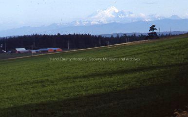 Photograph of Ebey's Prairie with the Olympic mountains visible in the background, as well as farm building structures in the left background.Photograph Details