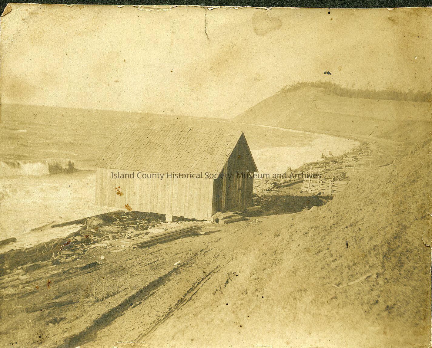 From other entry: Mounted photo, negative and print: W. B. Engle, then E. J. Hancock's storage warehouse at Ebey's Landing, from Lillian Huffstetler.Made/Created