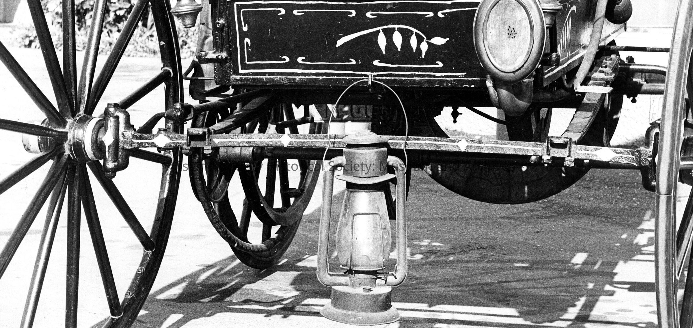 B & W photo close up of rear axle and wheel of Holsman. Lantern hangin from box of auto.