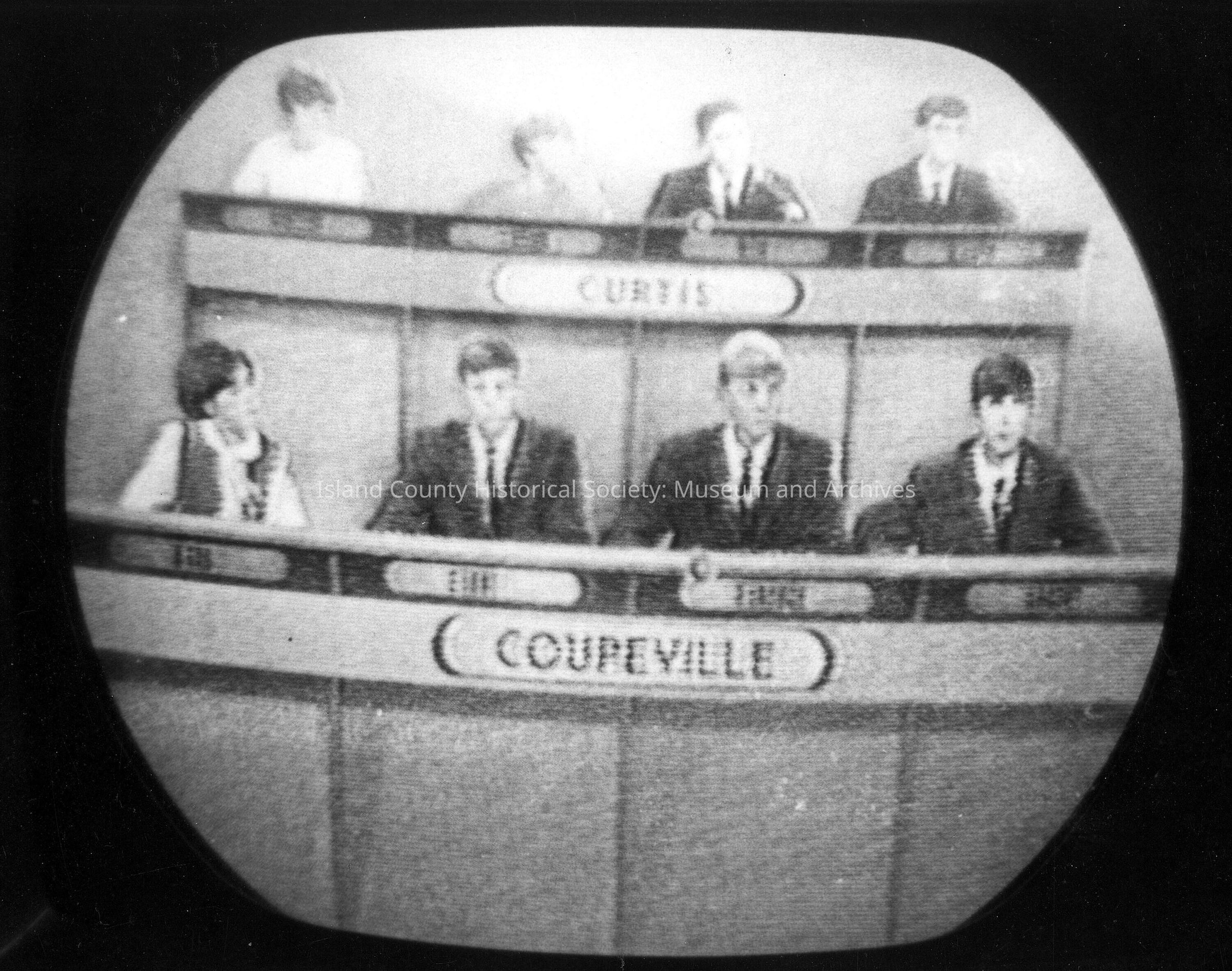 B&W photo from a TV set of "Brain Trust" TV show. Shows panel: Baas, Stone, Hancock and Argent