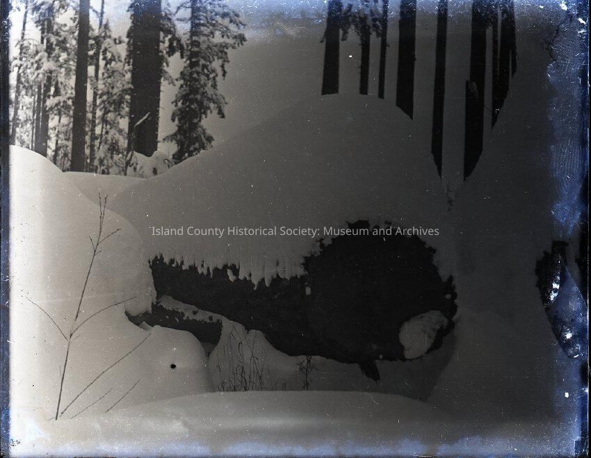 Close-up of a snow-covered log (in a snowbank) with trees behind it. 8 second exposure.Collection