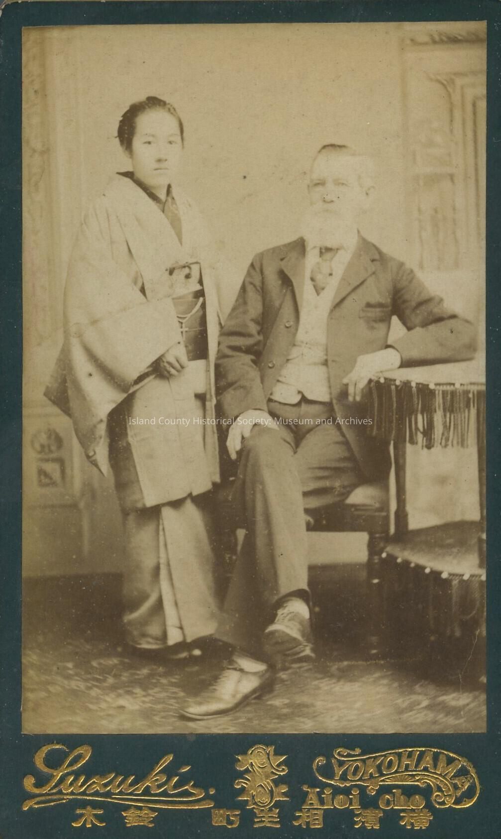 A photo of a white man with a large beard with a Japanese woman in a kimono