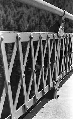 This black and white photo negative shows an outer view of the deception pass bridge railing.Made/Created