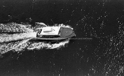 This black and white photo negative shows a speedboat going by the deception pass bridge.Made/Created