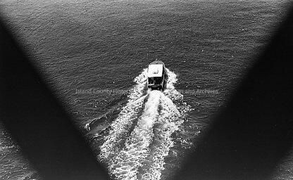 This black and white photo negative shows a speedboat going by the deception pass bridge. The photo was taken from behind the bridge railing.Made/Created