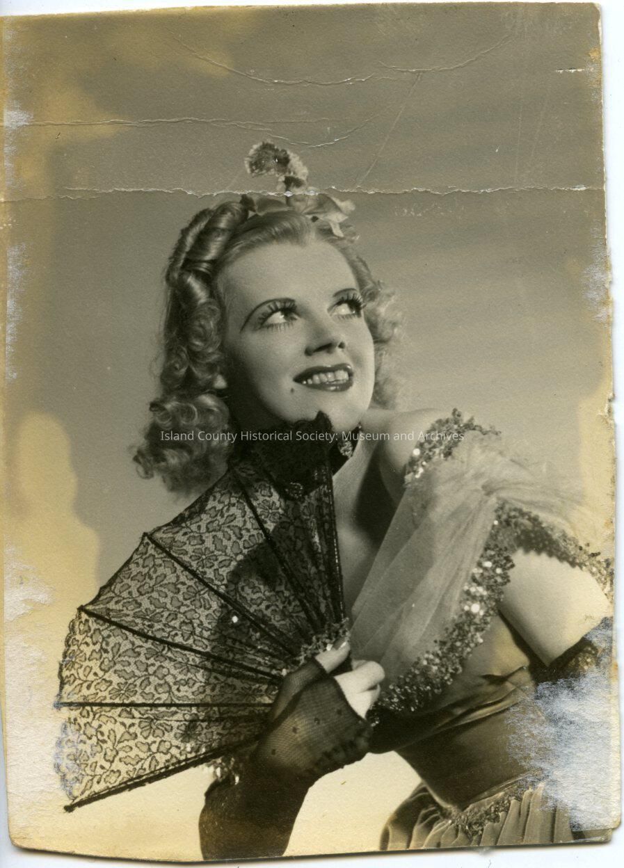 Black and white photo of Renee Villon (Kathryn Johnson) in elaborate stage costume: lace fan, lace gloves, gauze shawl, spangly dress. She is leaning forward looking back over her left shoulder. Photo is from her waist up. On the back: Renee Villon 1940