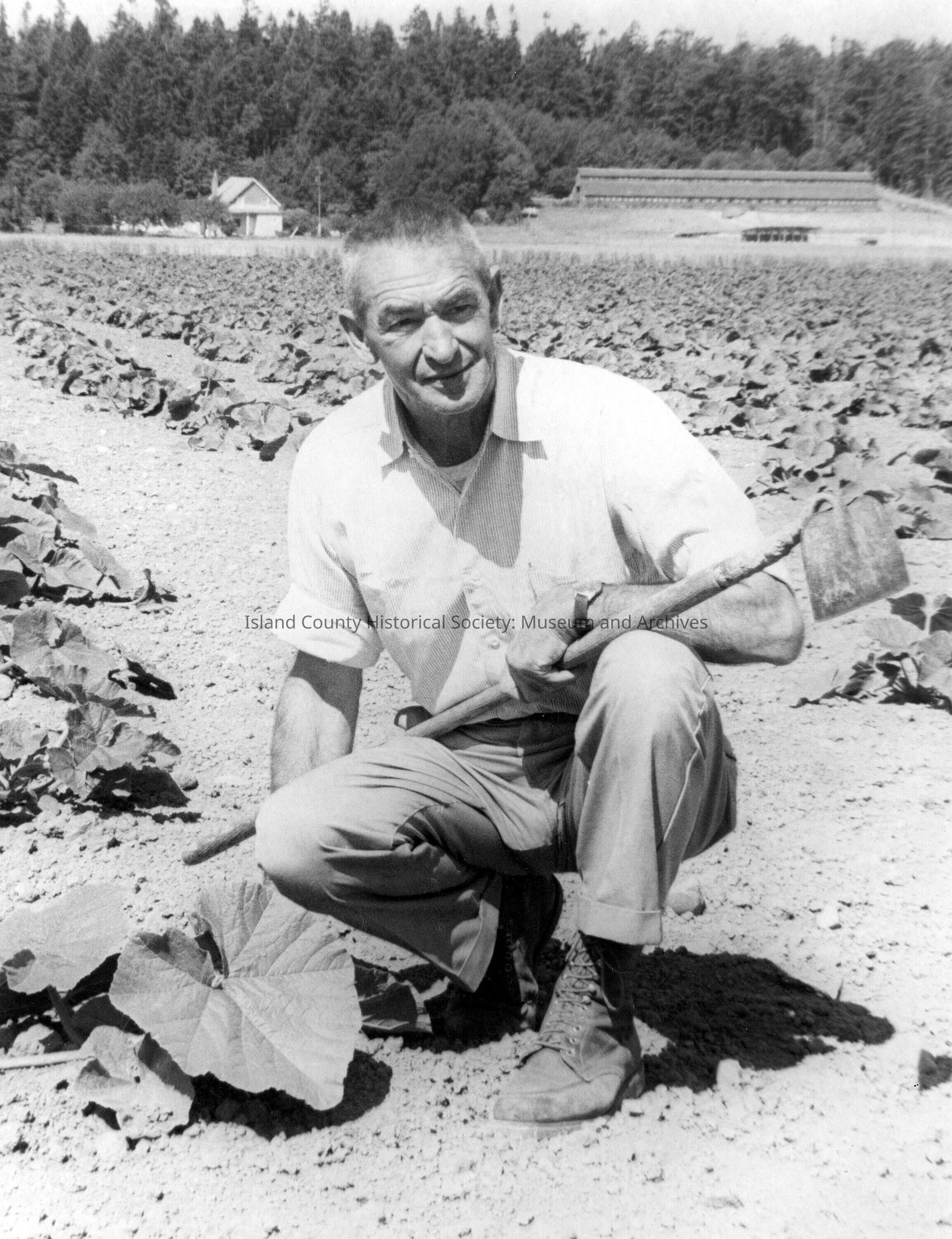 Floyd (Pat) Wanamaker hoeing squash at his farm.