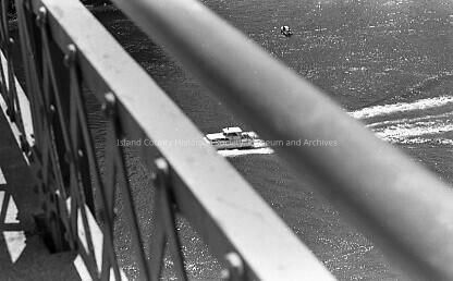 This black and white photo negative shows a speedboat going by the deception pass bridge. The photo was taken from behind the bridge railing.Made/Created