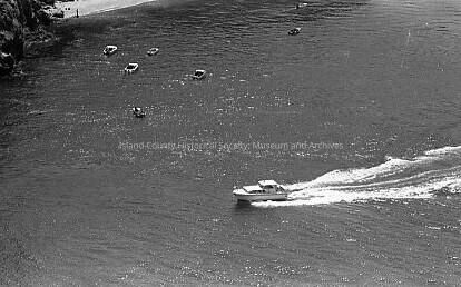 This black and white photo negative shows a speedboat going by the deception pass bridge.Made/Created