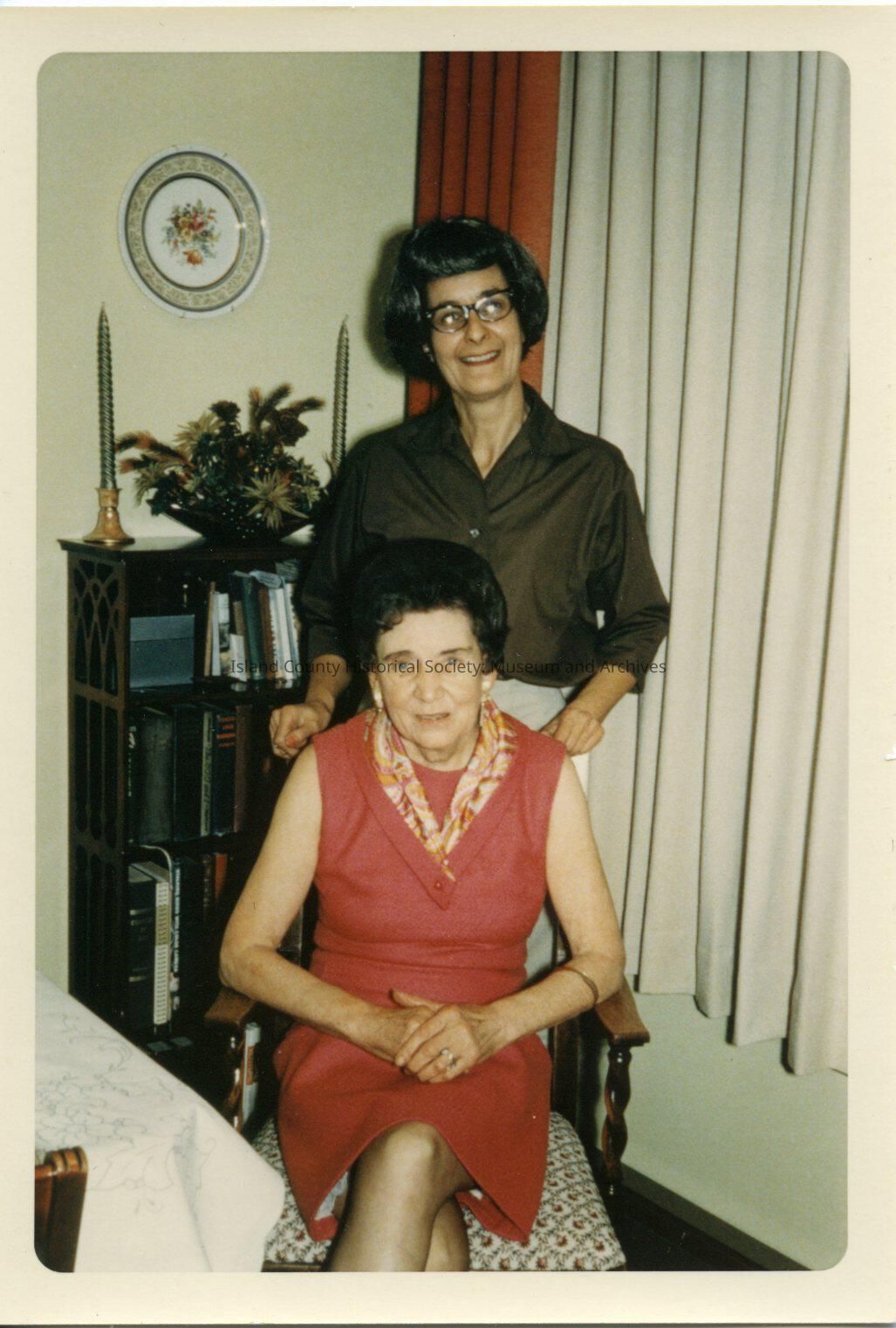 Color photo of 2 women, one seated in a red dress, Omma and Polly, Jan 1968. A bookcase with books, two candles and a small flower arrangement are behind them. Drawn curtains are to their left. A plate is on the wall.Made/Created