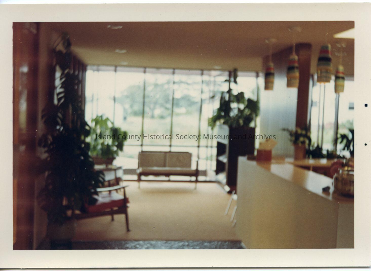 Color photo of Whidbey Medical Clinic, July 1966. W long floor-to-ceiling window is in the back with a short two-person seat in front. Other chairs to the left. Looks like that area is carpeted. Flower arrangements. A probably reception area to the right. The photo is a bit blurry.
