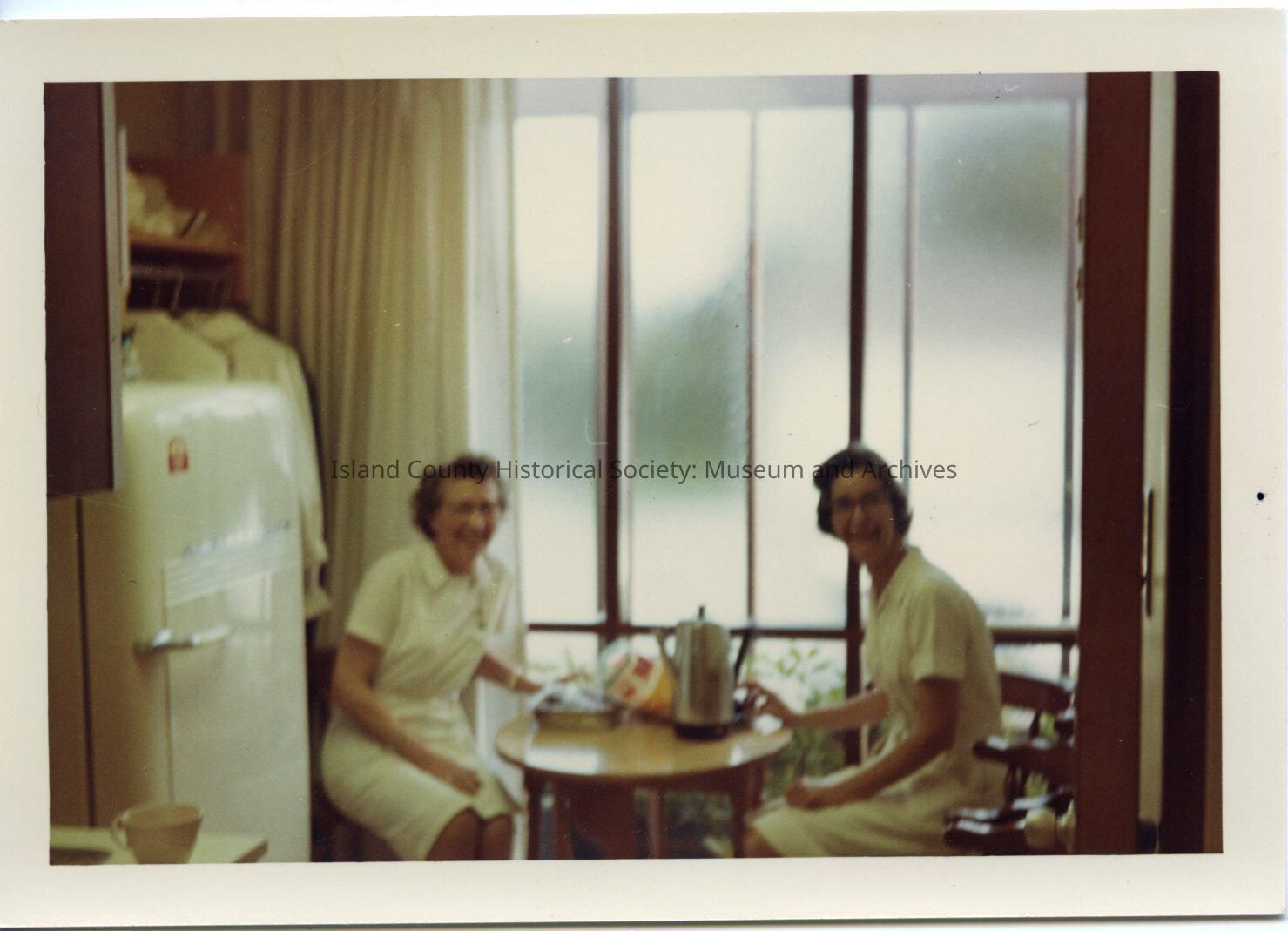 Color photo of Polly and another woman, July 1966, Library office. Two women are seated at a small round table, in front of floor-ceiling window, coffee pot and food on the table. To the left is a large refrigerator.Made/Created