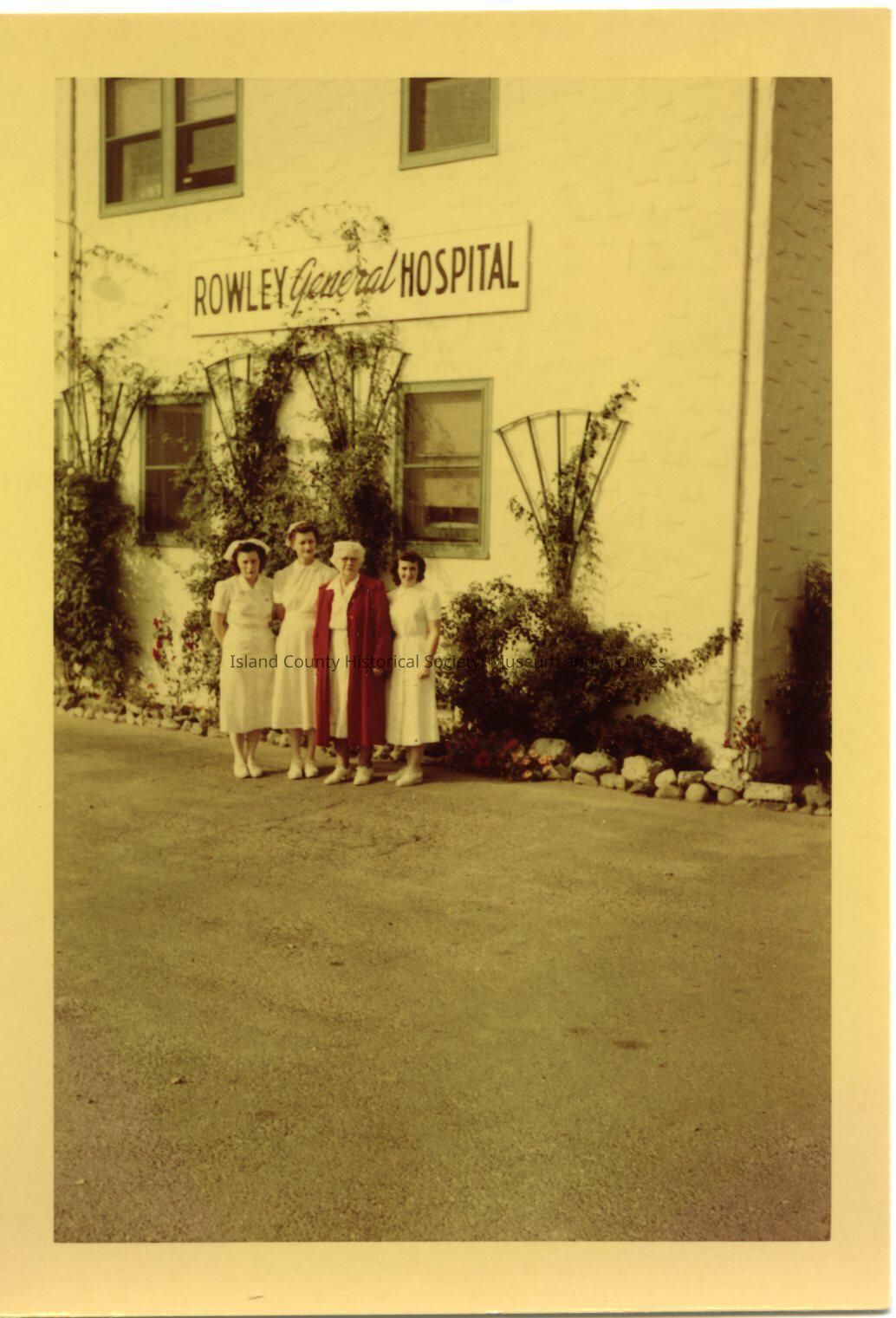 Color photo of 4 women standing outside Rowley General Hospital, note on back. One is wearing a red coat. At least two are in nurses uniforms.