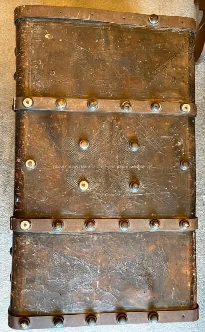 Leather made trunk by early pioneer John Kineth. Crossed the plains in 1852.