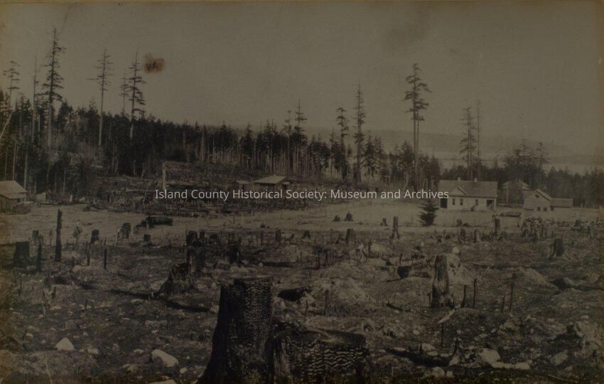 Black and white photo of logged area with wood frame homes and other structures. Trees were cut down about 3-5 feet above the ground and stumps left all over. On the back of the photo it states: