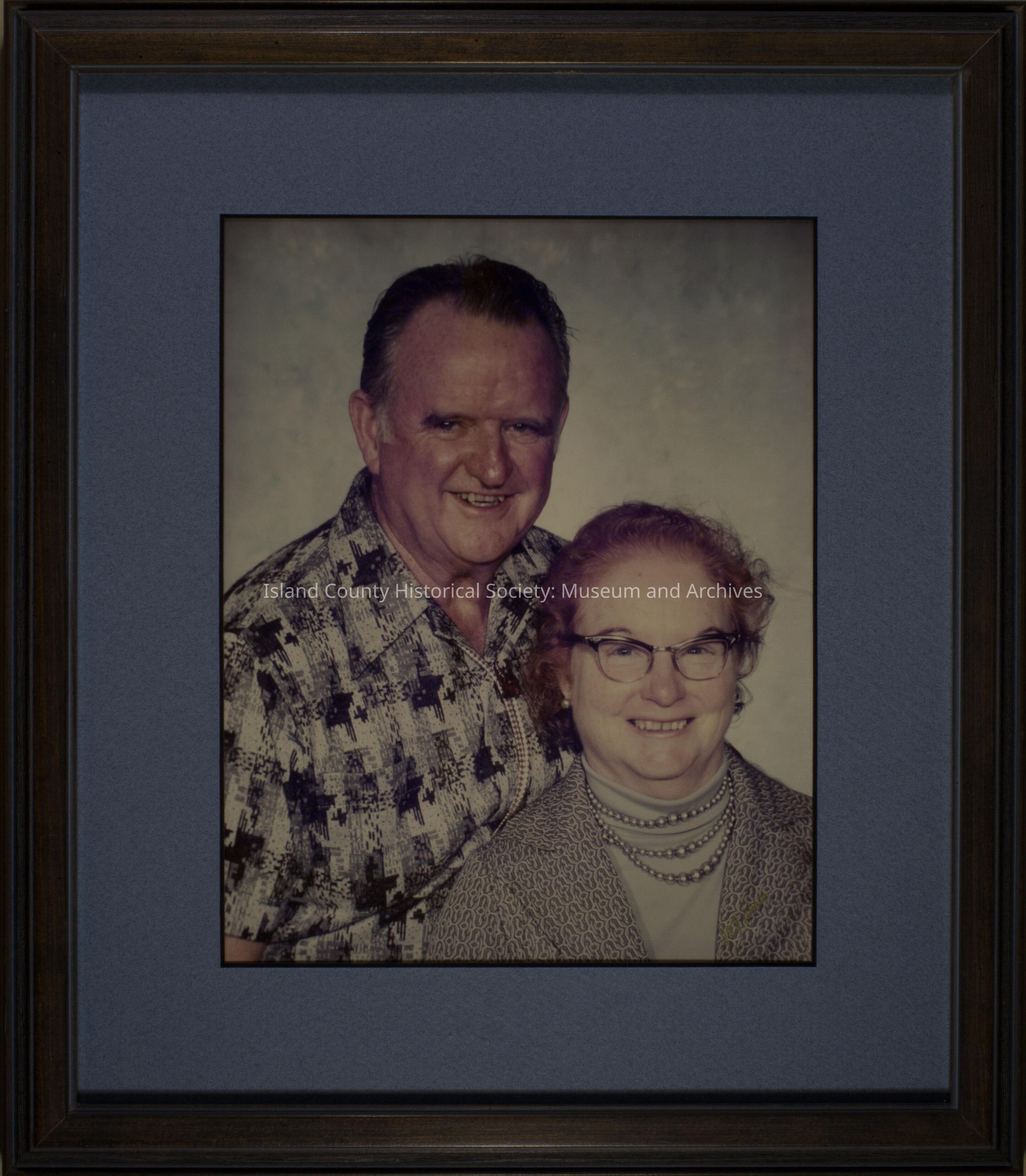 Brown and blue framed color picture with blue matting, of a couple, probably Orren and Ruth Ward (based on other photos in this set). No notations on the back.