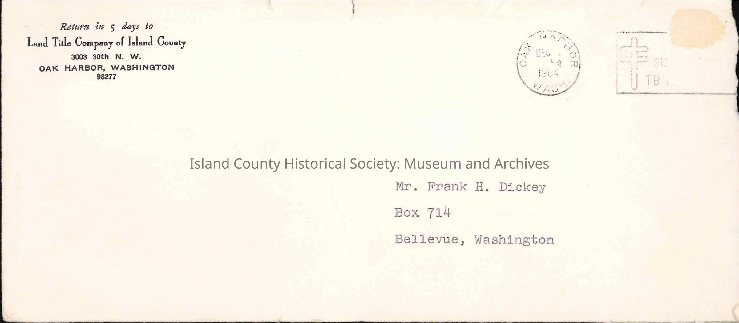 Empty envelope addressed to Frank H. Dickey, from Land Title Company of Island County. Envelope is torn open on right side.Collection