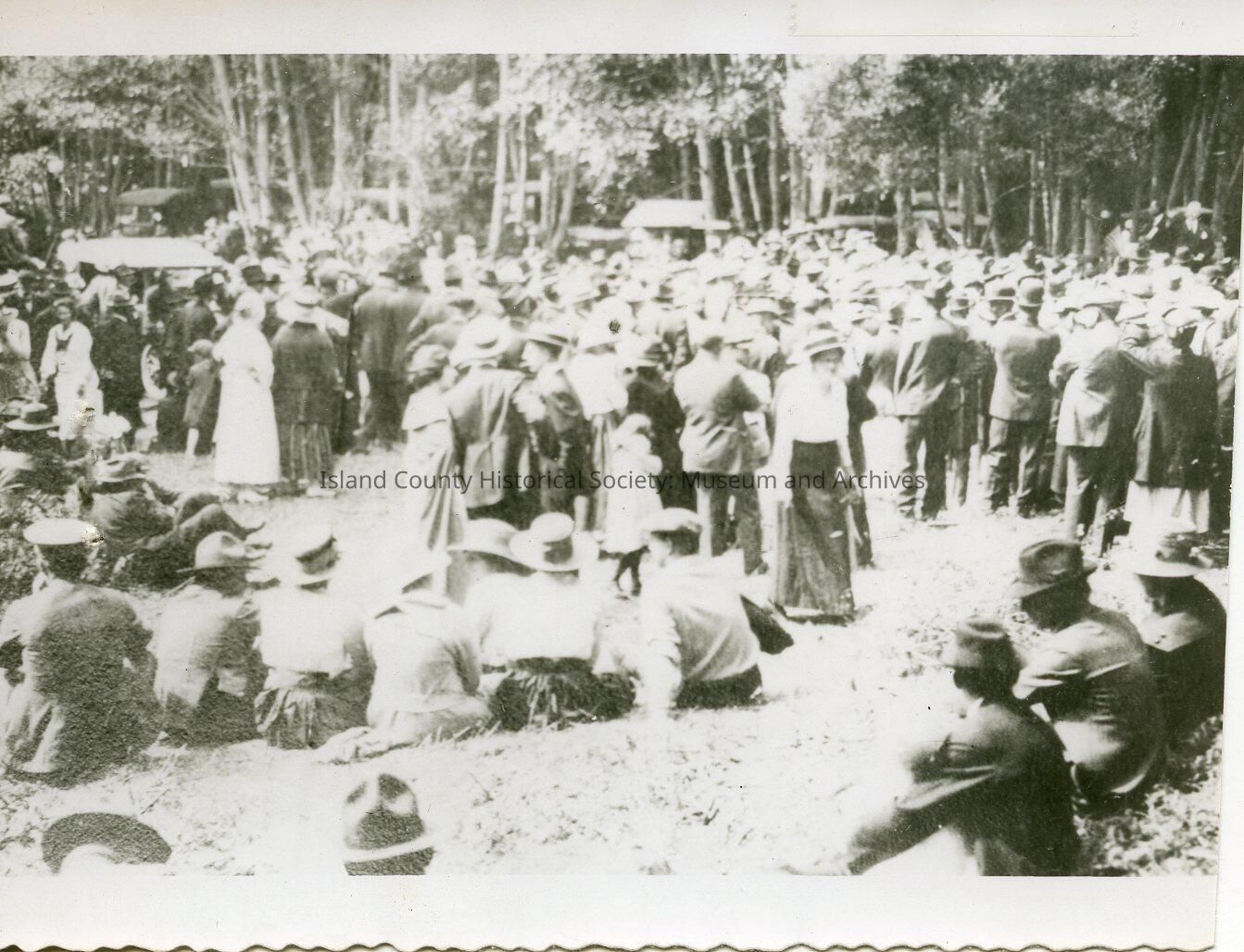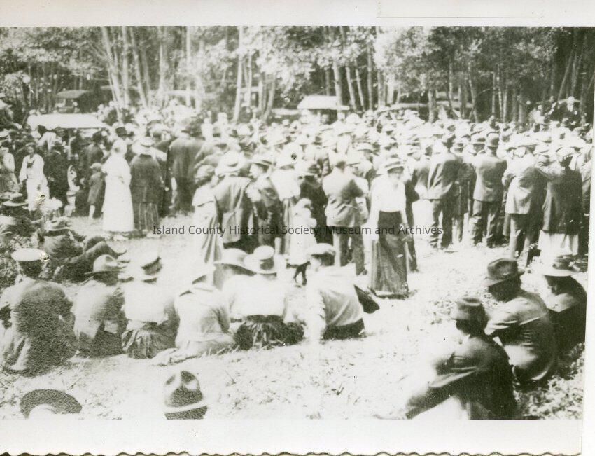 This black and white photo shows a group of people having a picnic. Beyond the people are trees and buildings