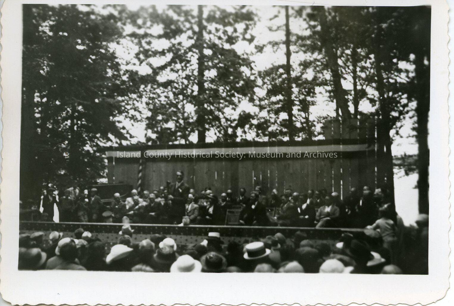 This black and white photo shows a gathering of people, there is a crowd that is gathered around a man with a mircrophone.