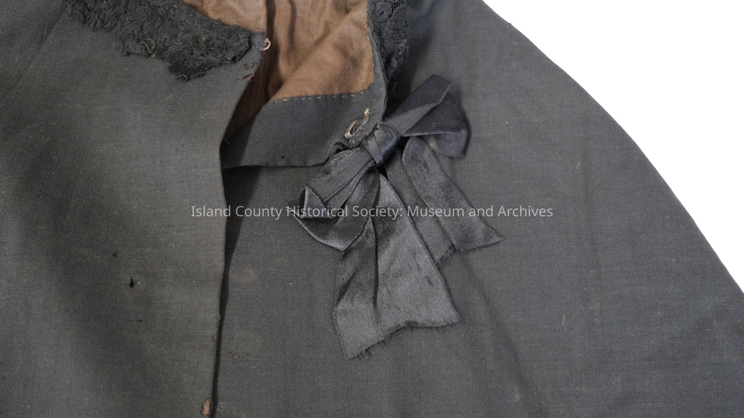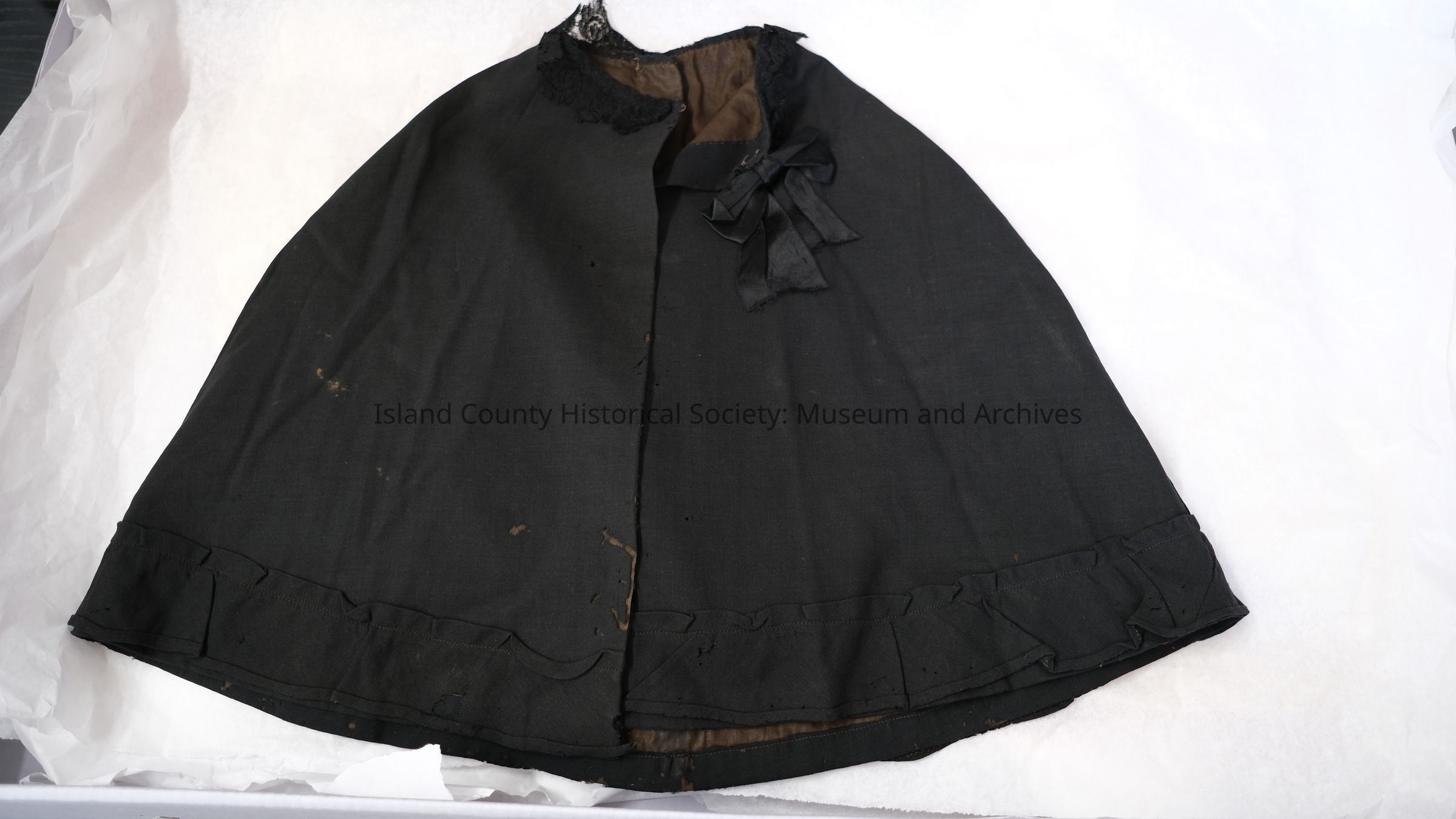 Short, black shoulder capelet, lightweight wool, narrow black lace around neck with small satin bow. Shows some moth damageCollection