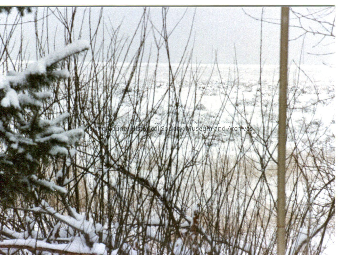 Fir branches and bushes in snow. Field in background. Digital copy of Kawasaki photo.