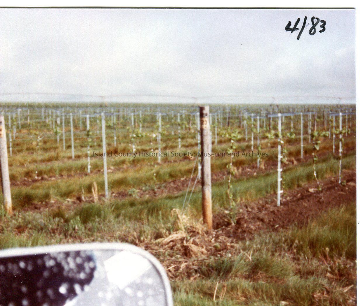 Rows of loganberry bushes, staked and tied. Auto mirror in front. 4/83 marked in corner. Digital copy of Kawasaki Greenbank Farm photo.