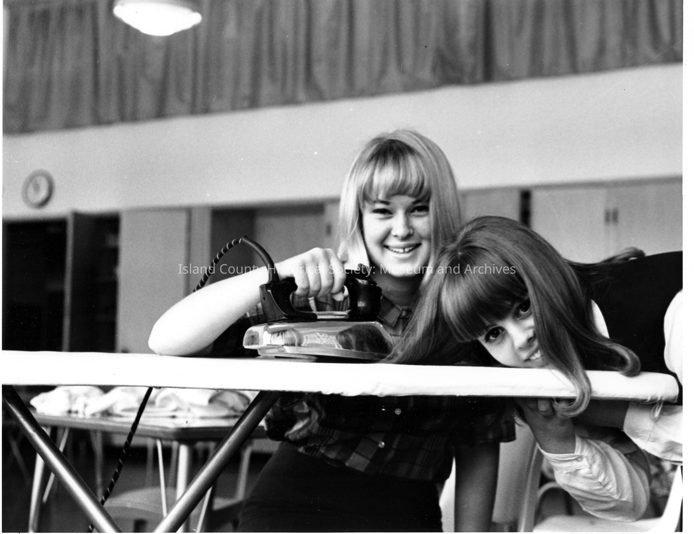 b&w photo of two unknown girls. One is ironing the other's hair.