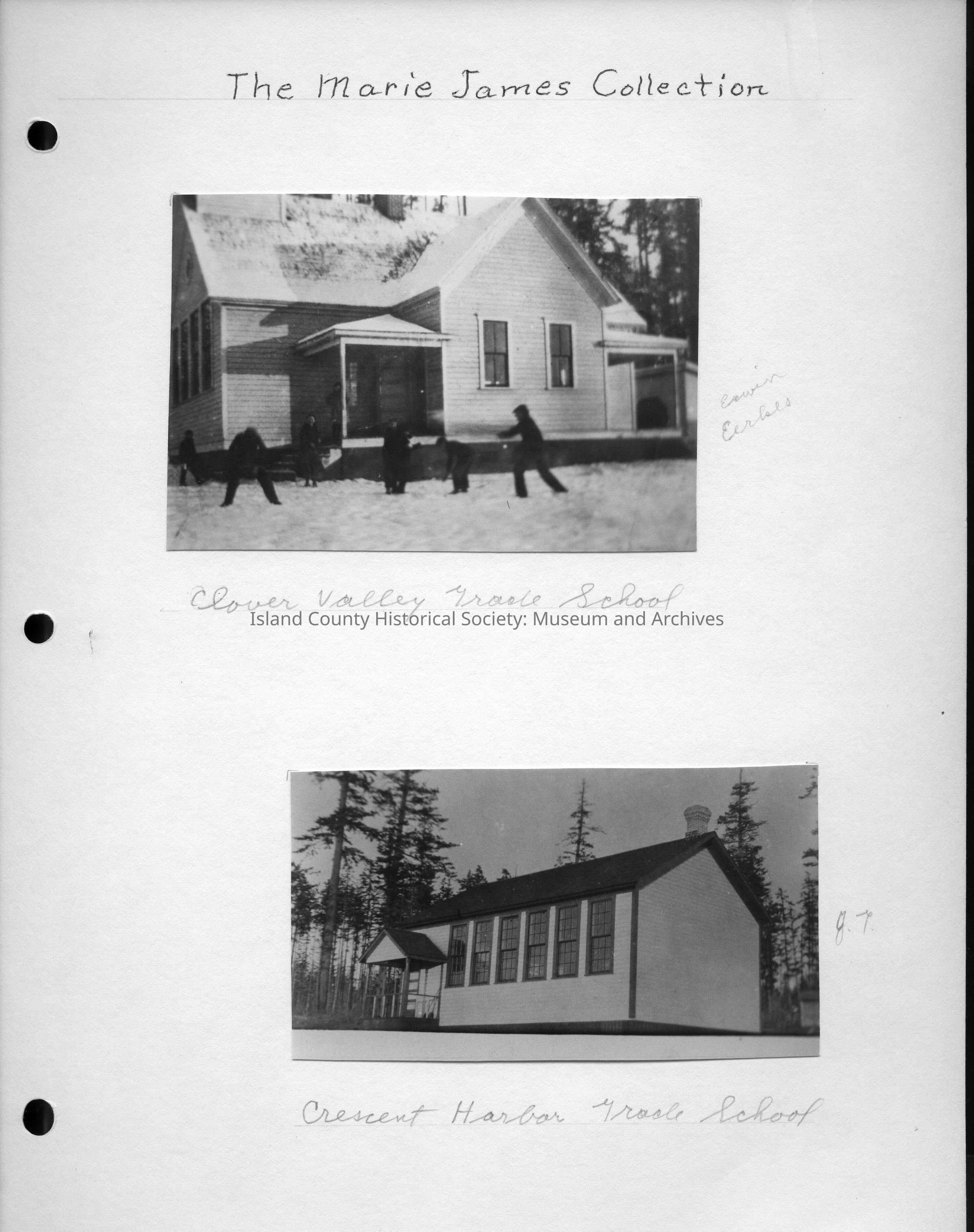 Bottom Photo - 4.5"W x 2.5"H - Photo of the Crescent Harbor Grade School. The school is a large rectangular white building with six big windows across the front and a portico over the entrance door at one end.