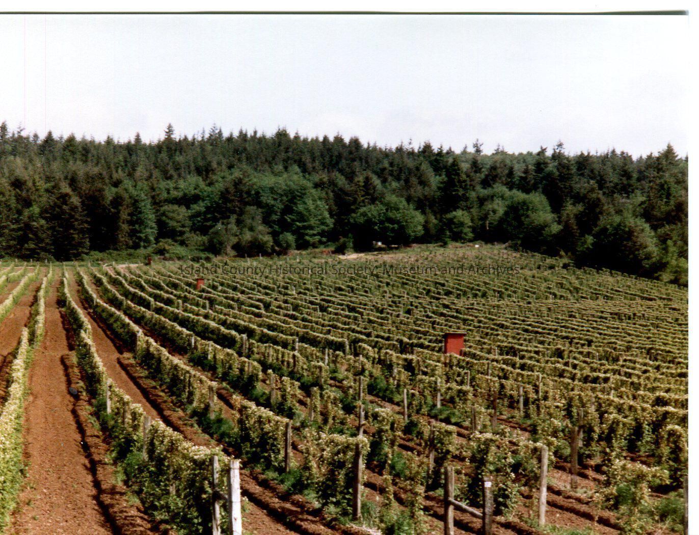 Rows of loganberry bushes, staked and tied. Leaves and flowers. Outhouses among rows. Trees in background. Digital copy of Kawasaki Greenbank Farm photo.