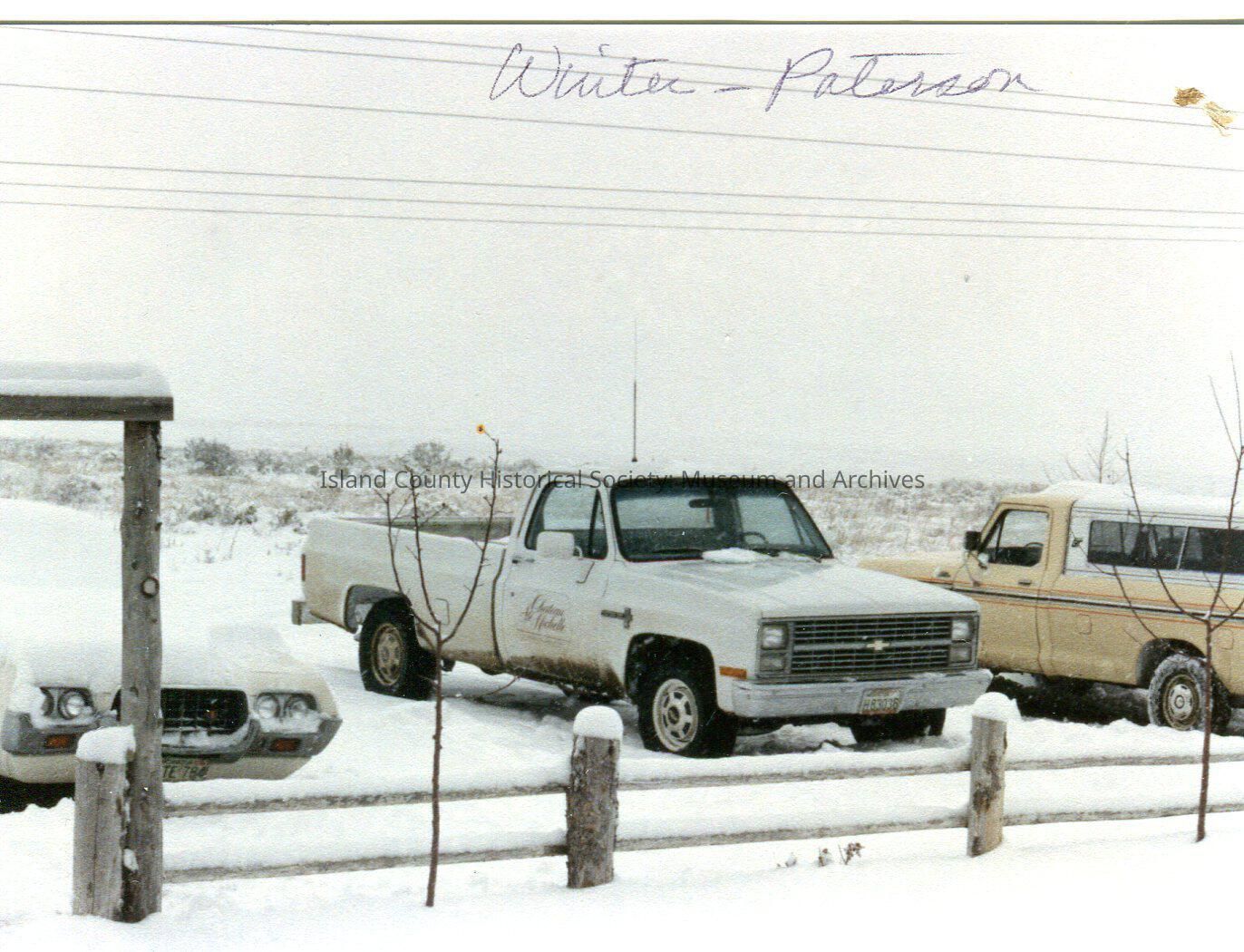 Two pickup trucks and car hood in snow. Ste Michelle sign on truck. Fence in foreground. Field in background. Winter-Paterson written on photo. Digital copy of Kawasaki photo.