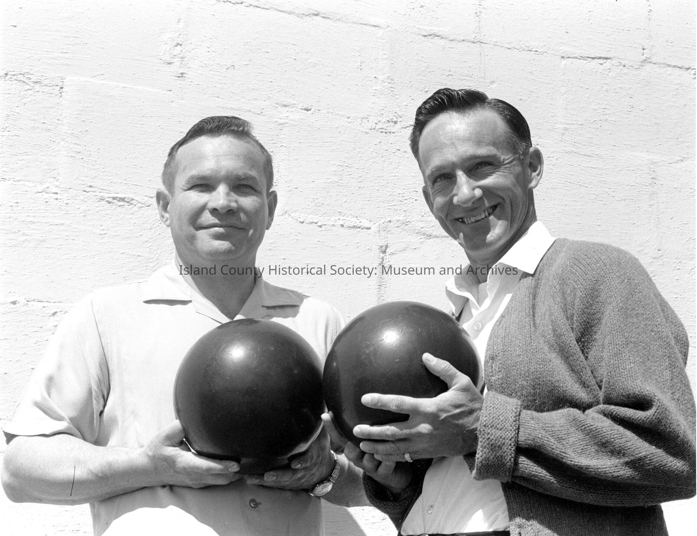 b&w photo of two men holding a bowling ball