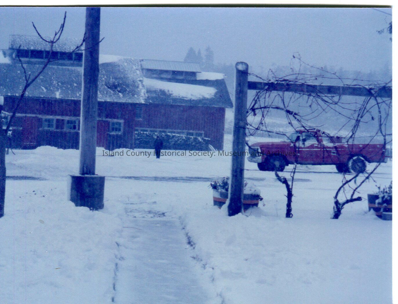 Pickup truck and barns in snow. Man walks near barn. Arbor in foreground. Digital copy of Kawasaki photo.