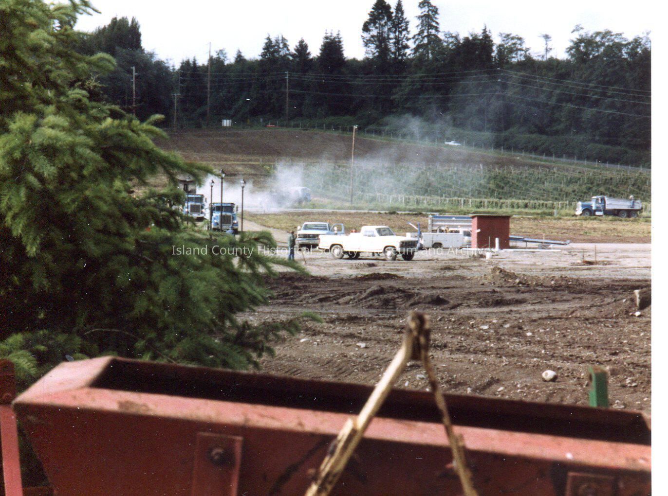 Large excavated area at Greenbank Farm during building of pond. Machinery in foreground. Line of dump trucks and trailors among loganberry bushes in background. Digital copy of Kawasaki photo.