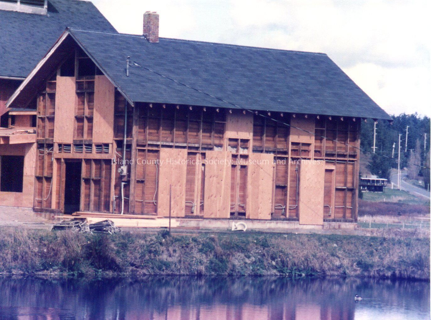 Renovation of small barn to south of main barn on Greenbank Farm. Siding has been removed and windows are covered. Pond in foreground. Digital copy of Kawasaki photo.