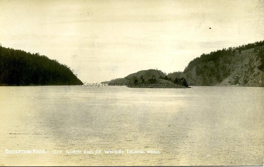 The black and white postcard was taken at Deception Pass off of the north end of Whidbey Island. The photo shows about four islands, the ocean doesn't seem to have to many waves, all of the islands in the photo appear to just have trees on them. The description on the back of the postcard: In memory of; Sarah Jane Crosby Kelley, Born Oak Harbor 1896-1962; Emmaline Enid Crosby Huntley, Born Oak Harbor 1902-1970;Parents: Frances George Crosby and Hannah Parker Crosby Came to Oak Harbor 1894