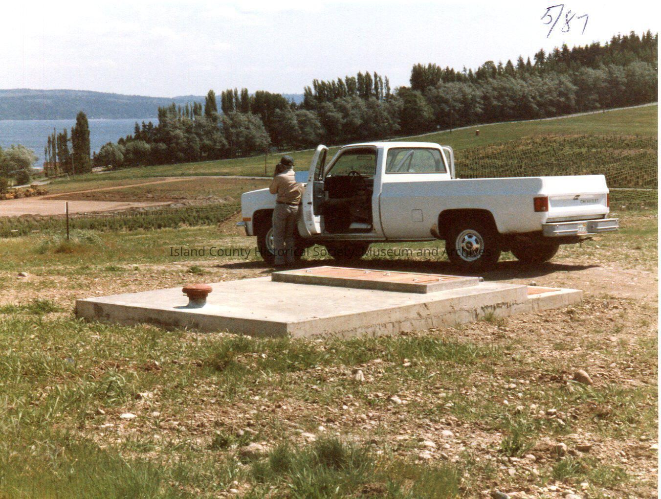 Truck parked on hill above loganberry field at Greenbank Farm. Door is open and man stands outside. Concrete structure which may be related to septic or well. Trees and Holmes Harbor in background. 5/87 written on photo. Digital copy of Kawasaki photo.