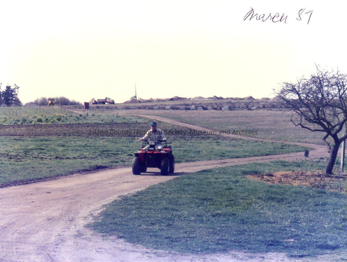 Man riding four-wheeler along road near loganberry field at Greenbank Farm. Dump trucks visible at top of hill. March 87 written on photo. Digital copy of Kawasaki photo.
