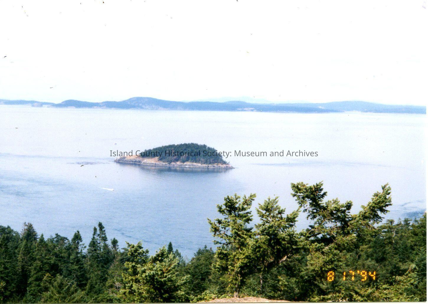 The color photograph shows that the day this was taken on was cloudy, and had a steady current of the ocean. The bottom of the photograph shows several evergreen trees, and in the middle of the photograph shows one island, in the background of the photograph shows a mountain.