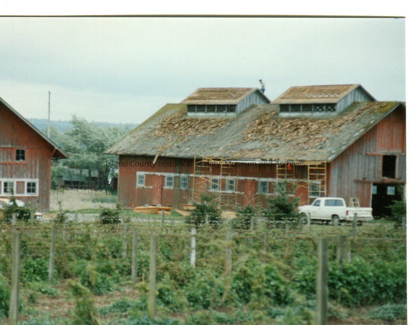 Main barn at Greenbank Farm. Scaffolding on side and man removing shingles on roof. Second barn to left. Loganberry plants in foreground. Digital copy of Kawasaki photo.