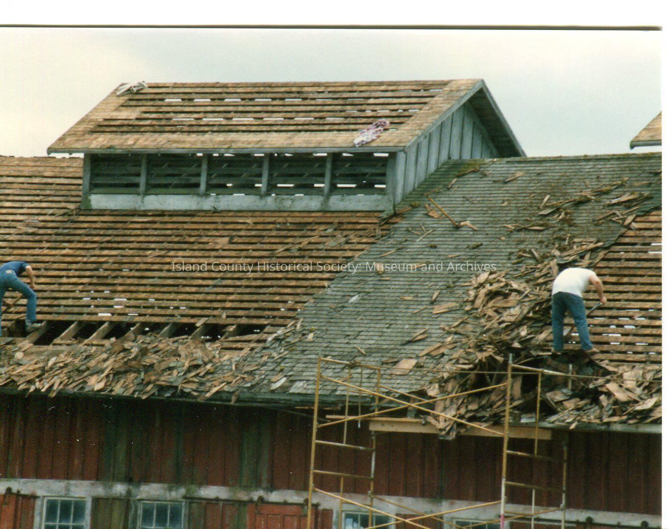 Main barn at Greenbank Farm. Scaffolding on side and men removing shingles on roof. Digital copy of Kawasaki photo.