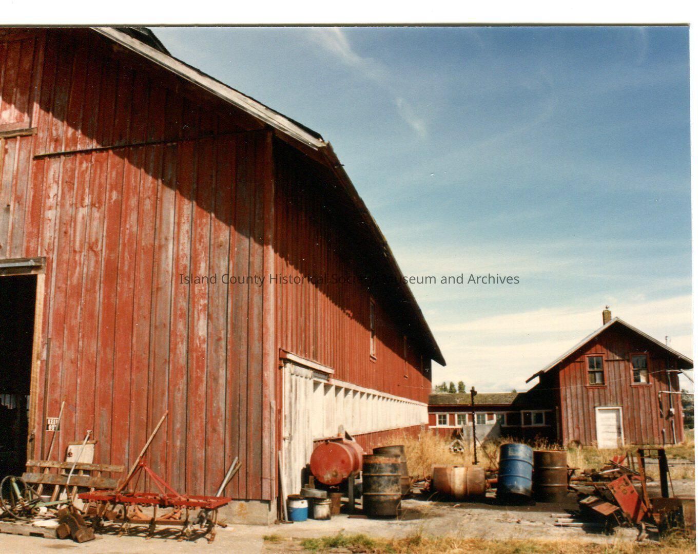 Main barn at Greenbank Farm before 1980's remodel. Barrels and machinery are stacked outside. Digital copy of Kawasaki photo.