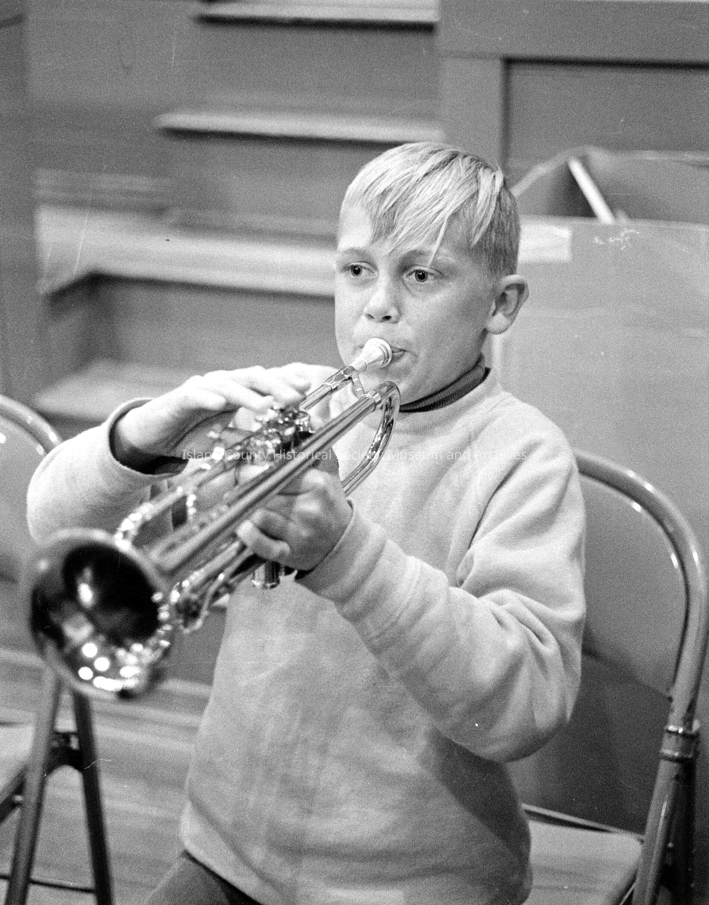 b&w photo of young boy playing trumpet