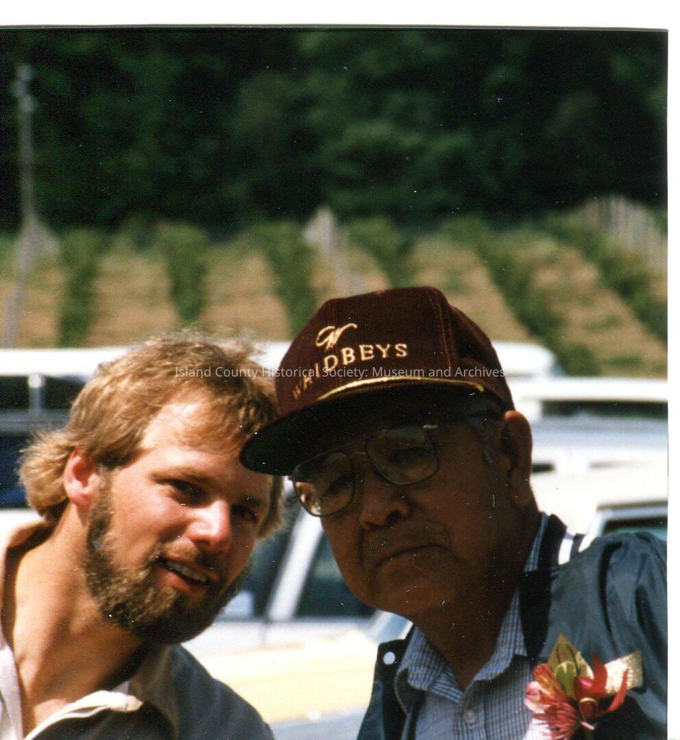 Celebration for opening of Ste Michelle Loganberry Liqueur production at farm in 1987. Mun Kawasaki wears a Whidbeys Hat and boutonniere. He is looking at something and another man looks on. Digital copy of Kawasaki photo.