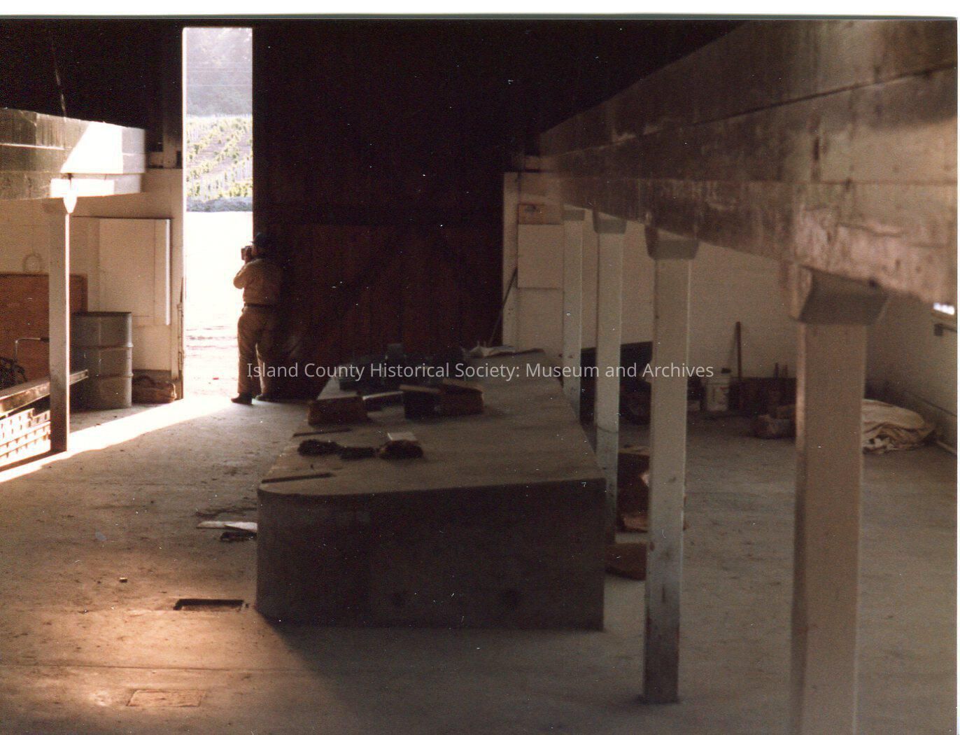 Interior of main barn at Greenbank Farm during renovation for liqueur production by Ste Michelle. Man stands near open door. Digital copy of Kawasaki photo.