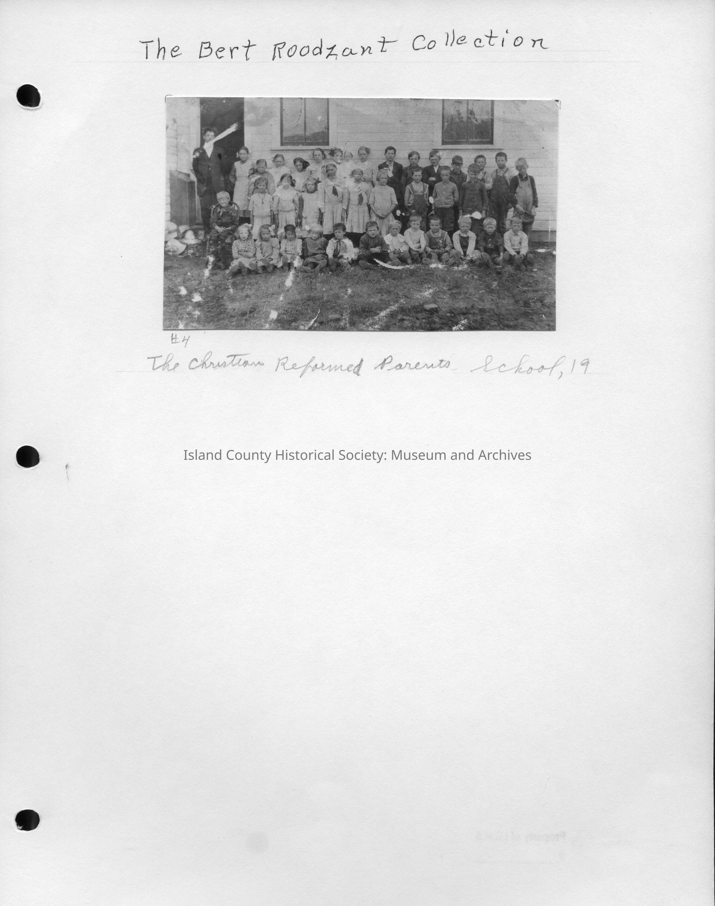 Top Photo - 4.5"W x 2.75"H - Group photo of a teacher and a large group of young children standing in front of the school building. The photo is titled, The Christian Reformed Parents School. No date.