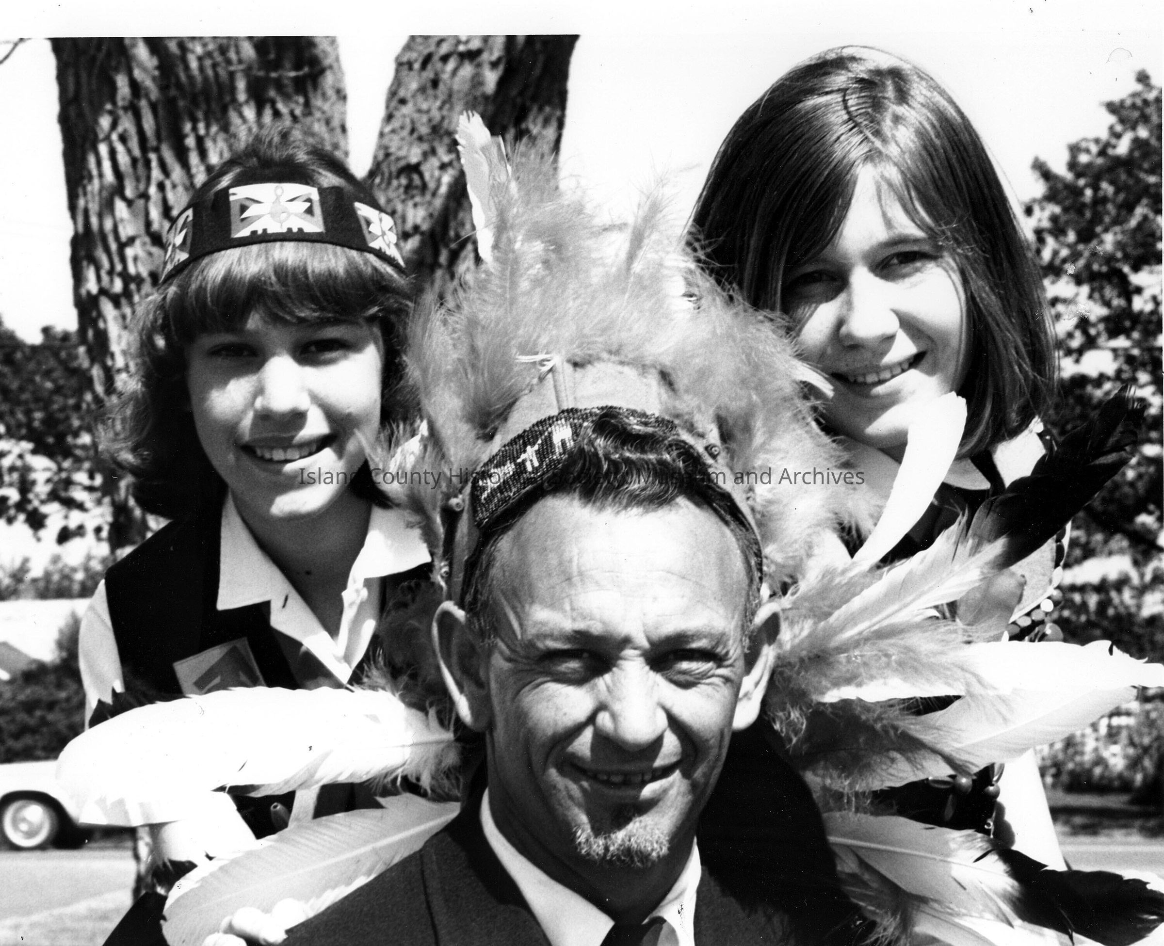 Man with two girls behind him. Man is wearing a feathered headband.
