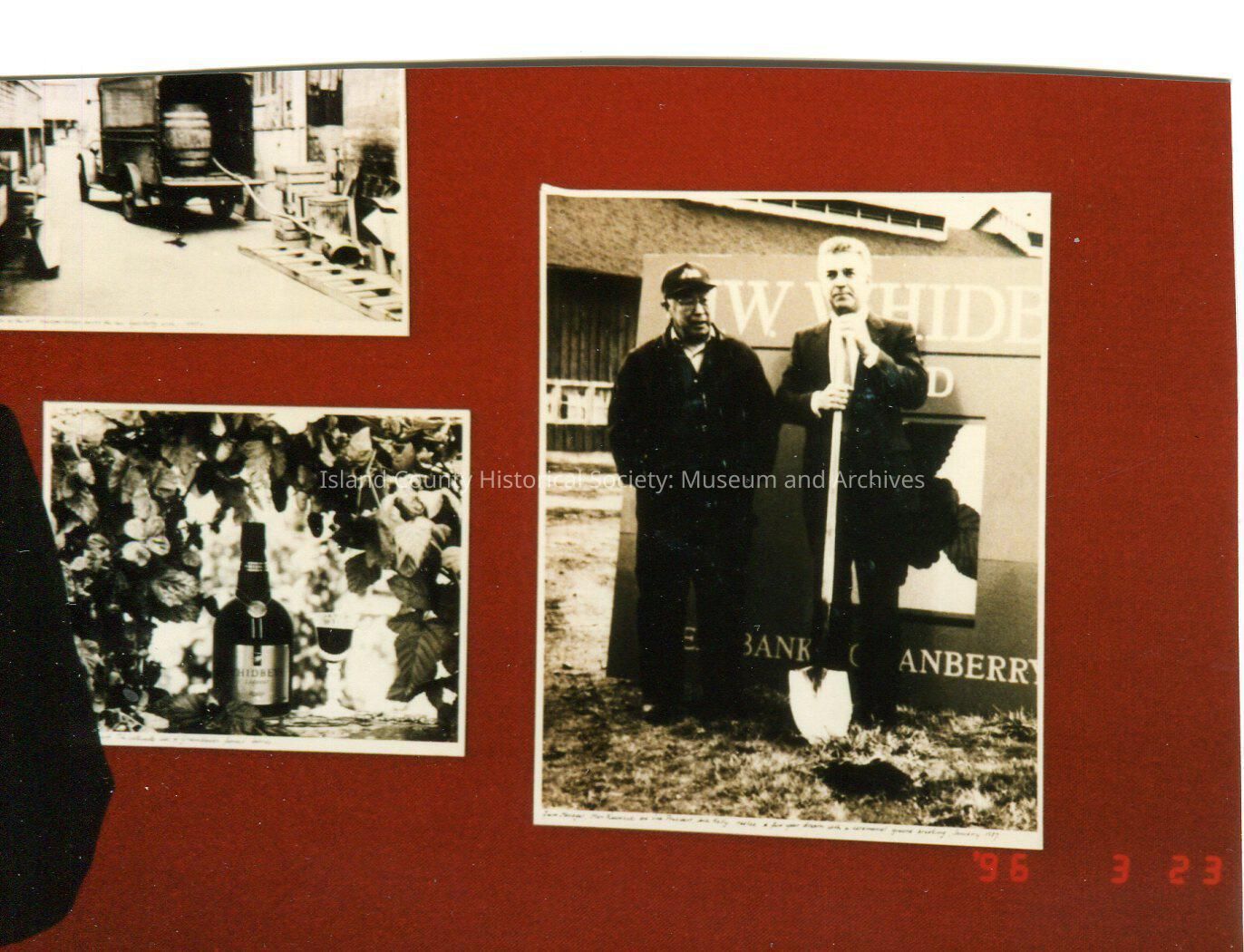 Photo of scrapbook page showing two photos of opening of Ste Michelle Loganberry Liqueur production at farm in 1987. In one, Mun Kawasaki, farm manager, and Ste Michelle executive stand in front of large label. Another shows bottle of Whidbeys Loganberry Liqueur. Partial third picture shows old truck carrying barrel. Digital copy of Kawasaki photo.Lexicon