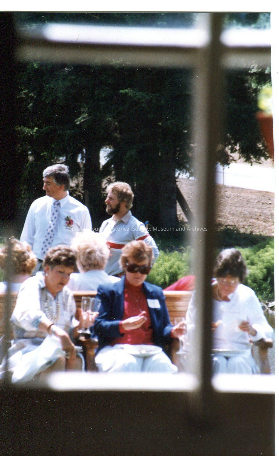 Opening of Ste Michelle Loganberry Liqueur production at Greenbank Farm in 1987. Men and women with glasses of champagne/liqueur. Digital copy of Kawasaki photo.