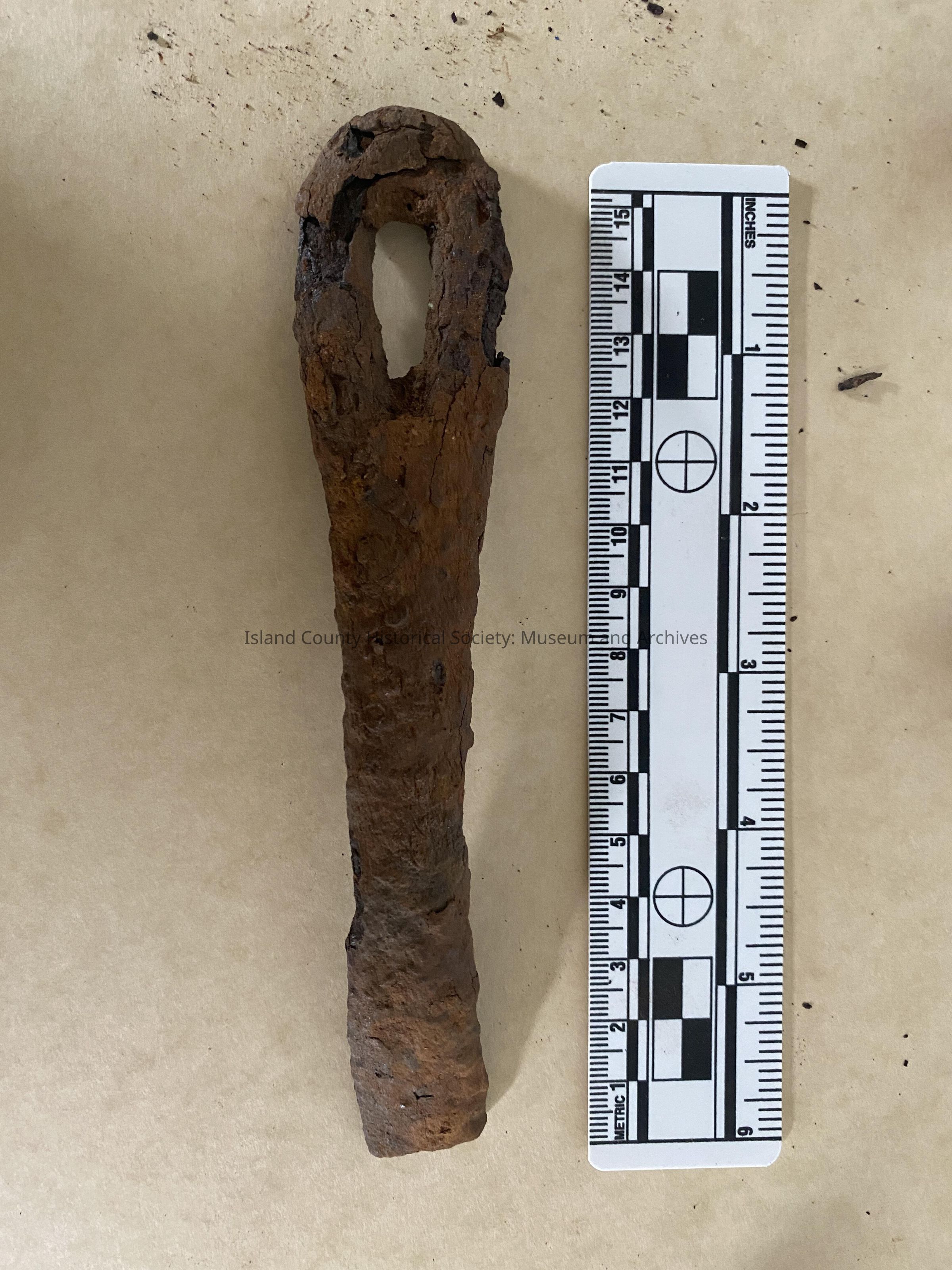 Handle, likely from a frying pan, retrieved from the Captain William Robertson Donation Land Claim by Kellan Diamanti and Deborah Fisher with permissions from Judee Lea, property owner at the time.