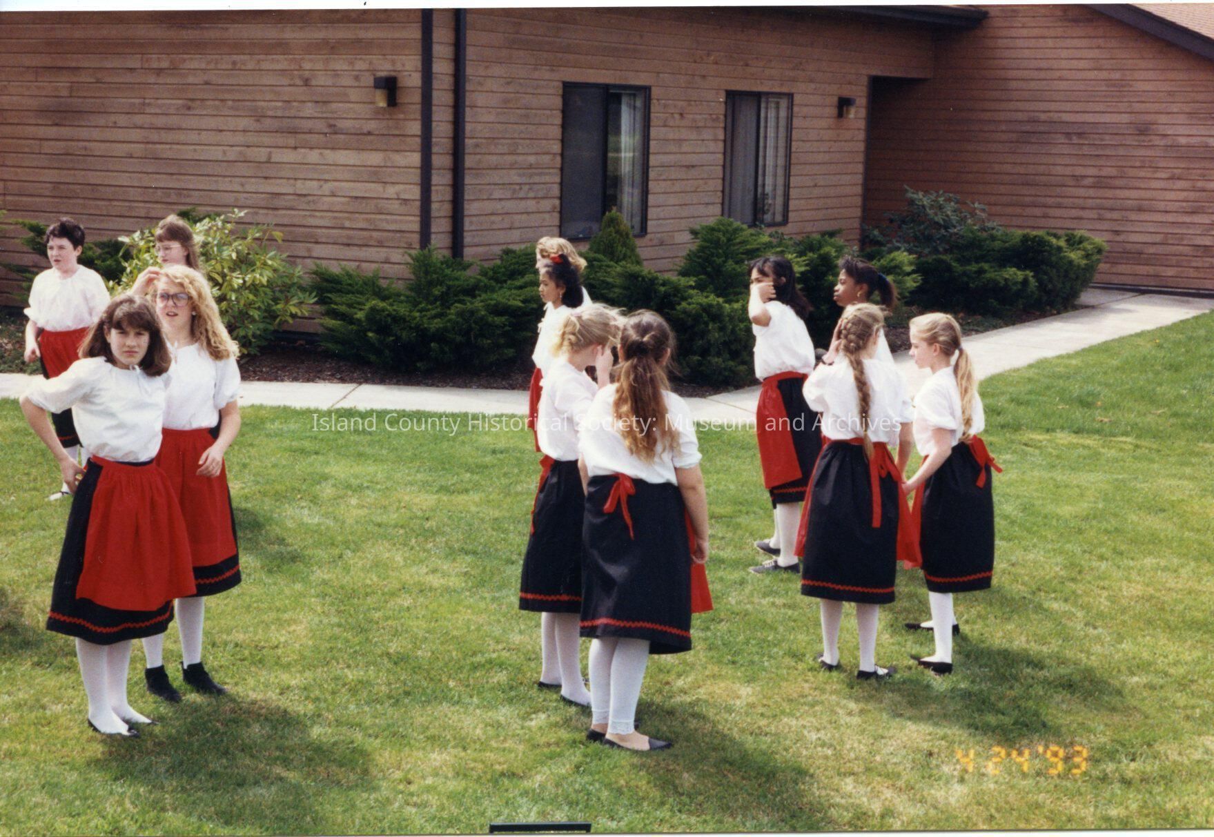 Color photo of a group of girls in white shirts and stockings, red aprons and dark skirts, standing in a circle in pairs. They are waiting to dance. Dated Apr 23, 1993